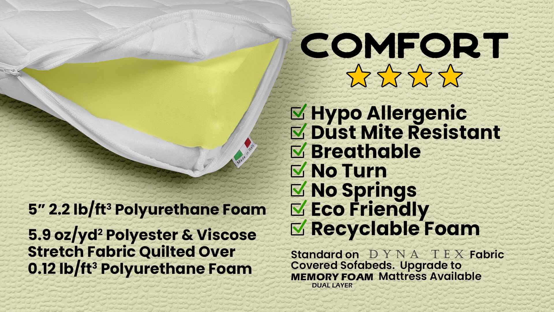| Foam type | Memory: 4" Dual layer - 1.2" 3.1 lb / ft3 Memory Foam - 2.8" 1.9 lb / ft3 High Density Polyurethane Foam |
